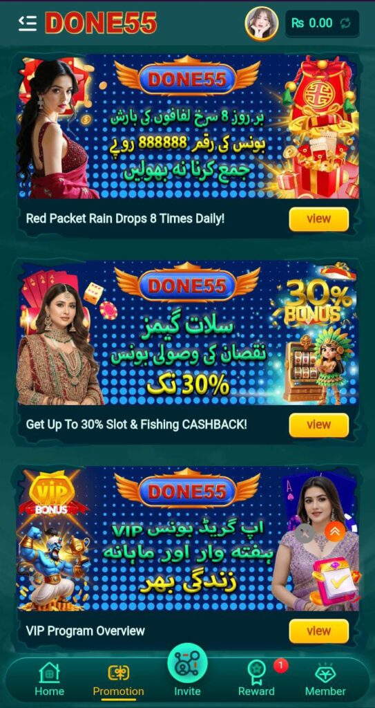 Done 55 is basically an online casino and earning app tailored for folks in Pakistan. It packs in slot games, lottery vibes, live casino sessions, and special reward events. The app runs like a charm on Android phones, even the ones with limited storage. You can start with tiny deposits and jump into various modes. It’s all about blending fun with a shot at making money.